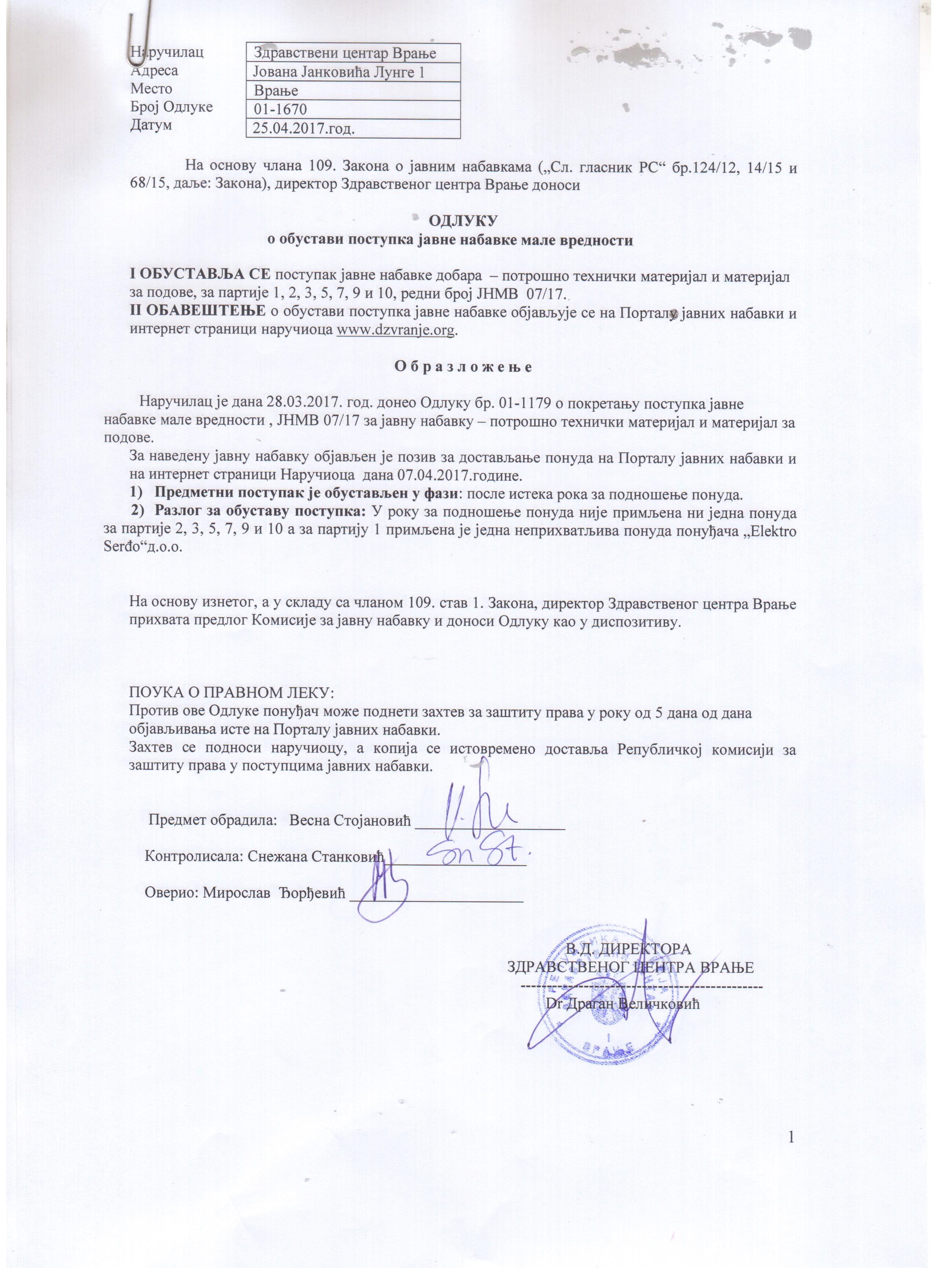 Одлука о обустави ЈНМВ 07-17