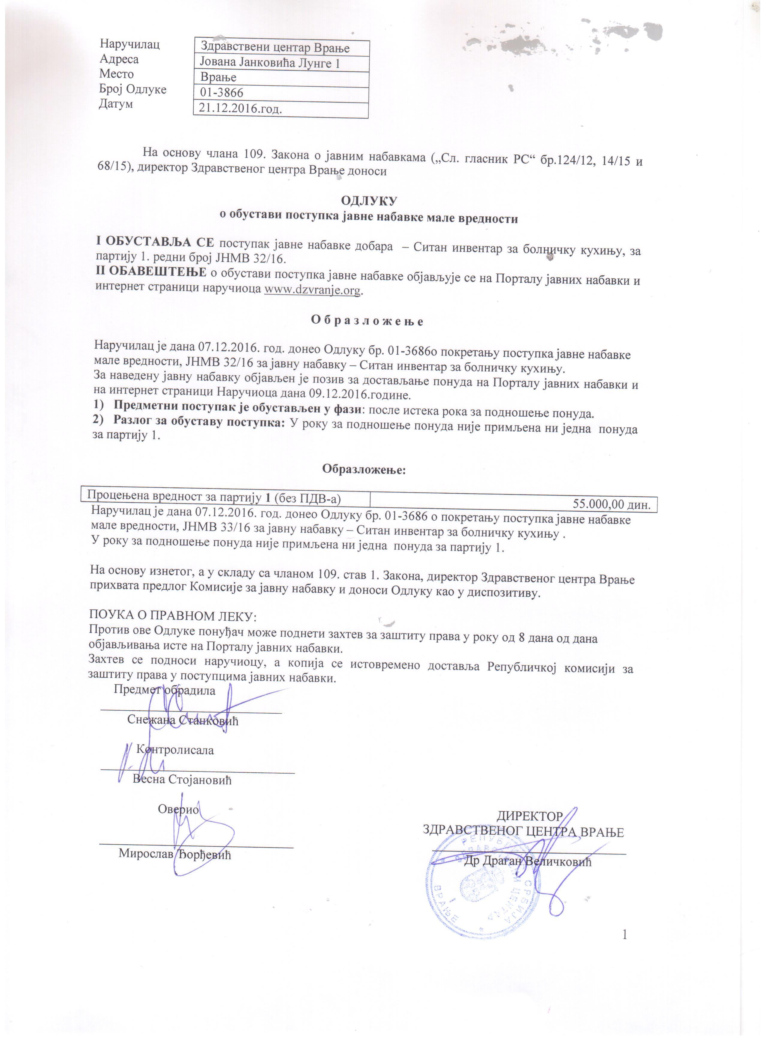 Одлука о обустави ЈНМВ 32-16