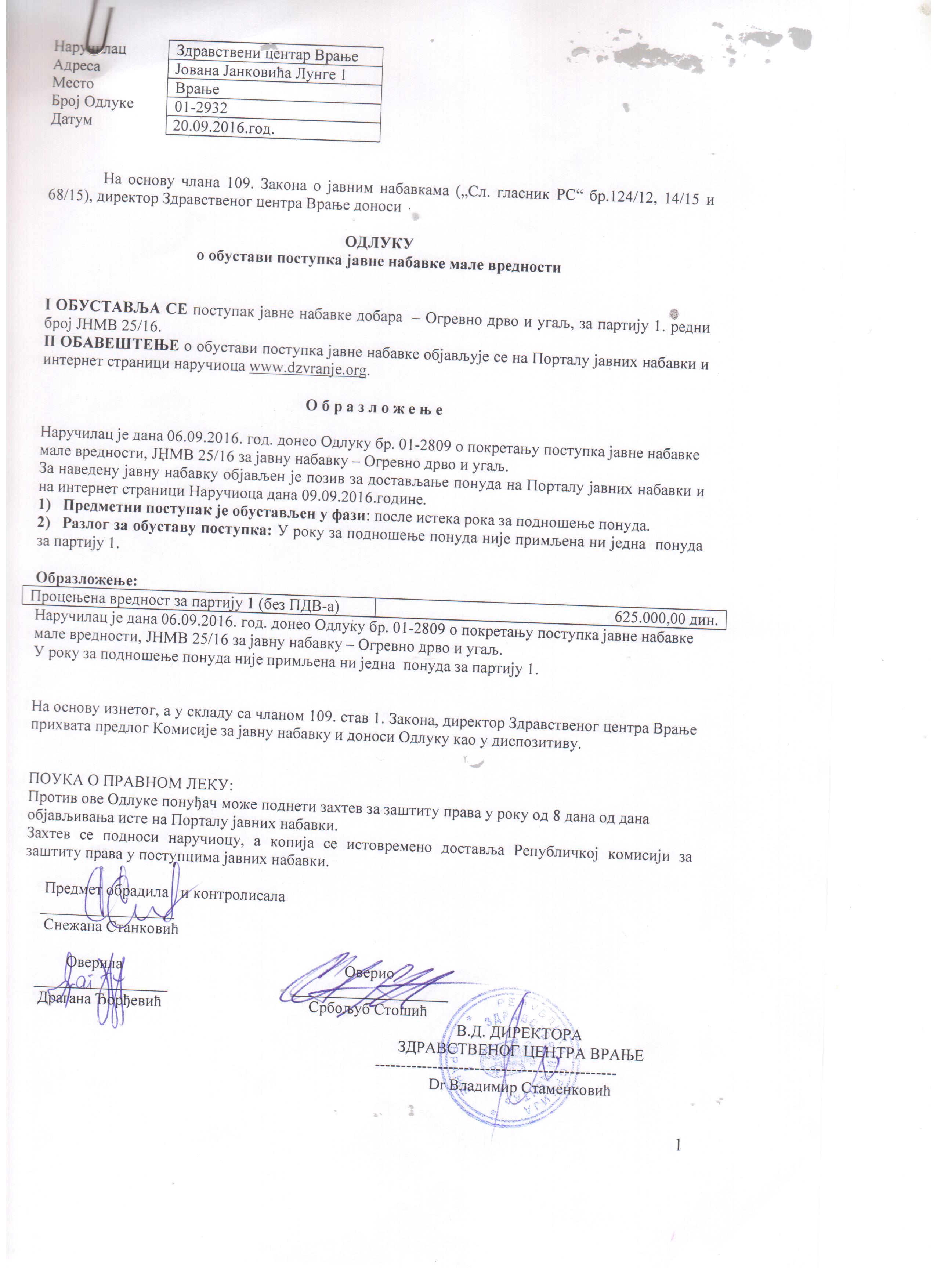 Одлука о обустави поступка ЈНМВ 25-16