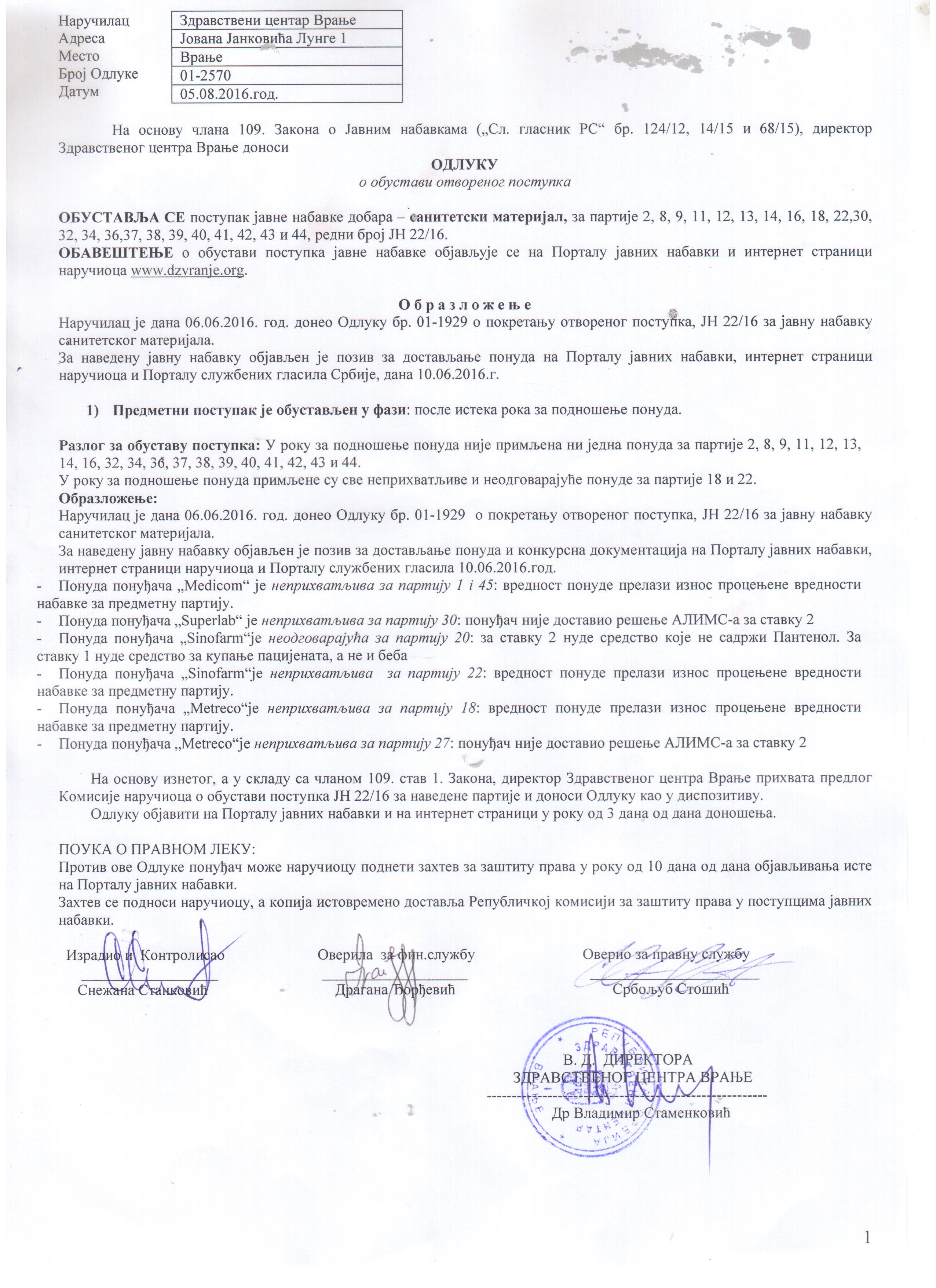 Одлука о обустави ЈН 22-16
